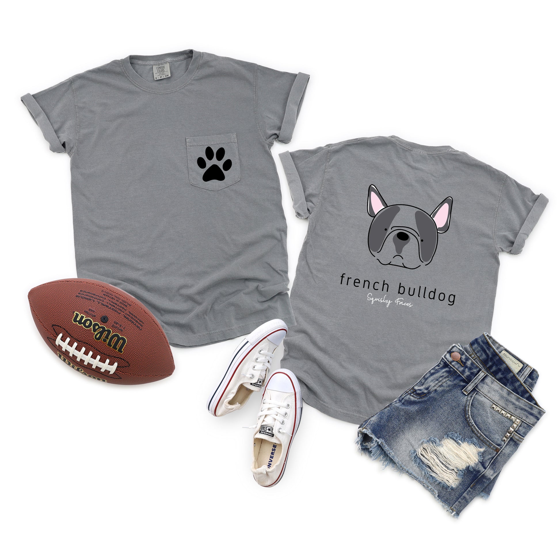 We LOVE French Bulldogs and this face is one to love for sure. Classic coloring with cute pink ears and gray markings make this a great shirt for all Frenchie lovers and even for you! This shirt is ready for everyday wear because it is soft and stylish. The adorable face and lettering printed on the back and a black paw print on the front pocket adds just the right amount of design. Do you know someone who would love this tee as much as they love their Frenchie? Comfort Color Tees are made to be super soft and last for a long time. We print our designs direct to garment so the art lasts as long as the shirt. Unisex sizing makes it easy to get a great fit. 100 percent ringspun cotton, soft-wahed garment-dyed fabric has easy care instructions.