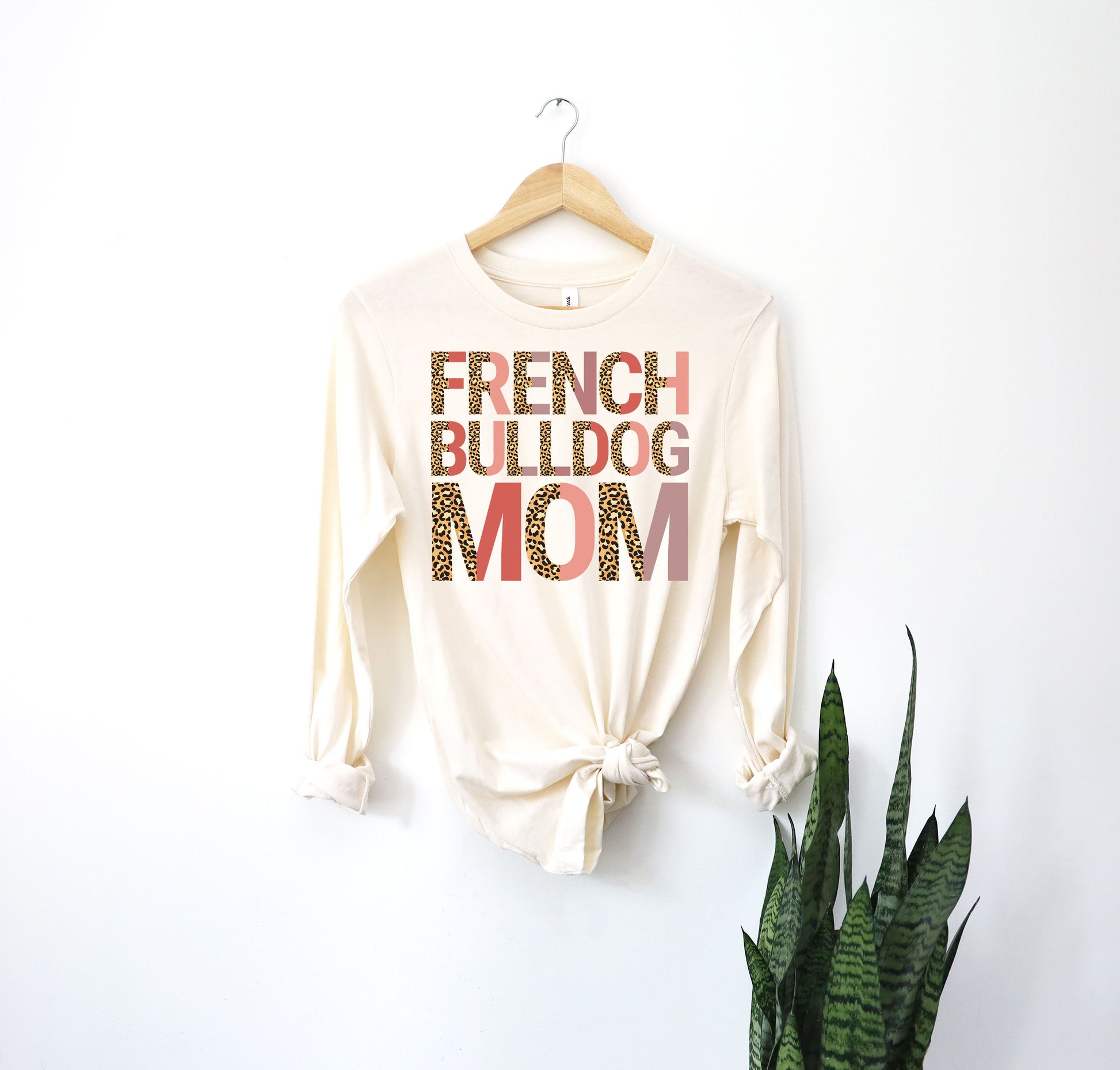 Proud French bulldog parents love to show off their Frenchies and there is no better way to do that than wearing this long sleeve shirt with "French Bulldog Mom" printed on it. The natural color of this shirt and the leopard font will make this a favorite in your closet fast!