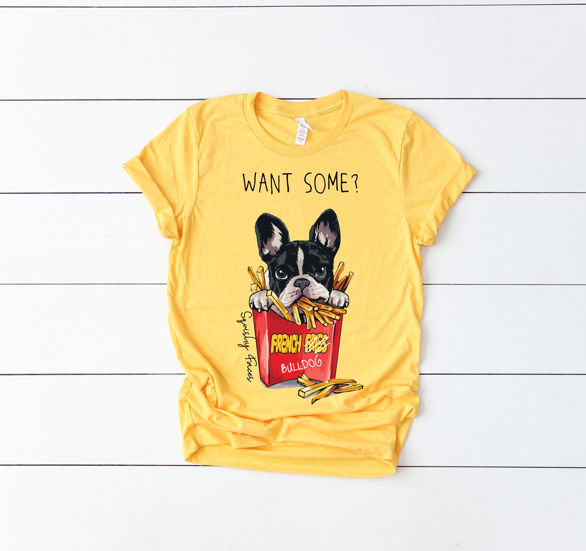 Who wants a little French bulldog with their fries? We’ve all been there at one time or another, whether it’s your dog or someone else’s. You just sit down to eat and you can feel the eyes on you…..begging…..for just one fry. This little guy got tired of waiting and just jumped in the whole box! He’s happy as can be steeling your food and your heart with this sweet design. This is perfect addition to your wardrobe, your neighbor’s wardrobe or anyone on your shopping list that is a Frenchie lover!