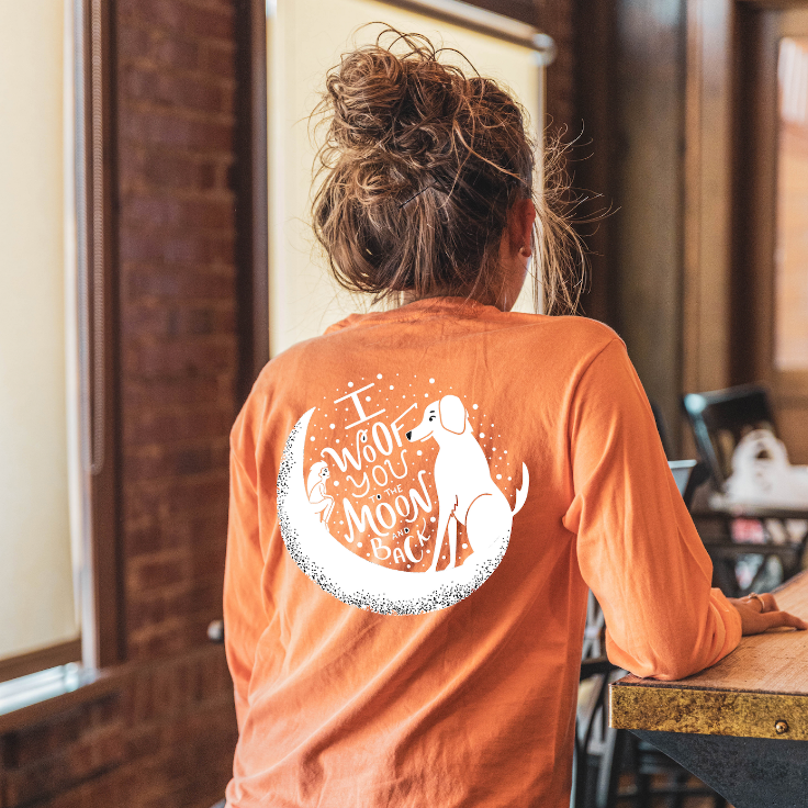This cute long sleeve dog shirt is the perfect color to stand out in a crowd. Especially when you are going to be around dog lovers. Make sure that you tell them where they can get one just like you! When you shop with us you help support rescues all over the country. 10% of your sales go to our monthly rescue partner.