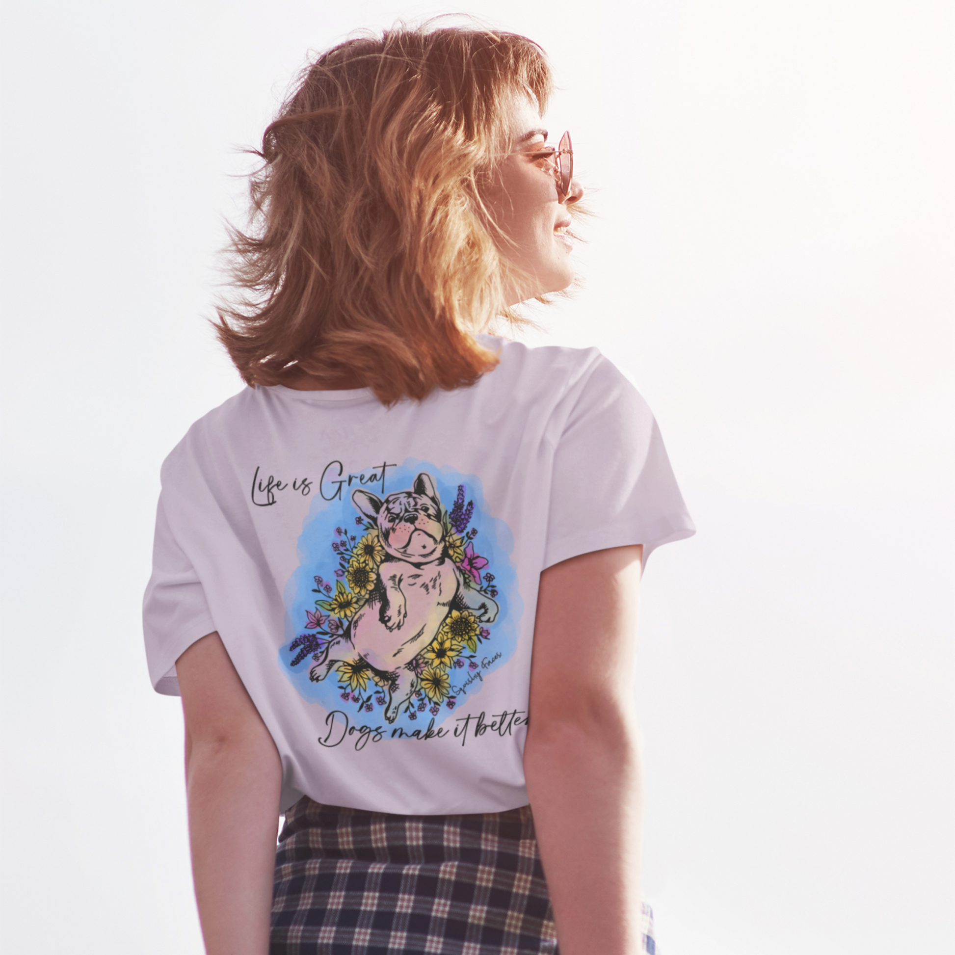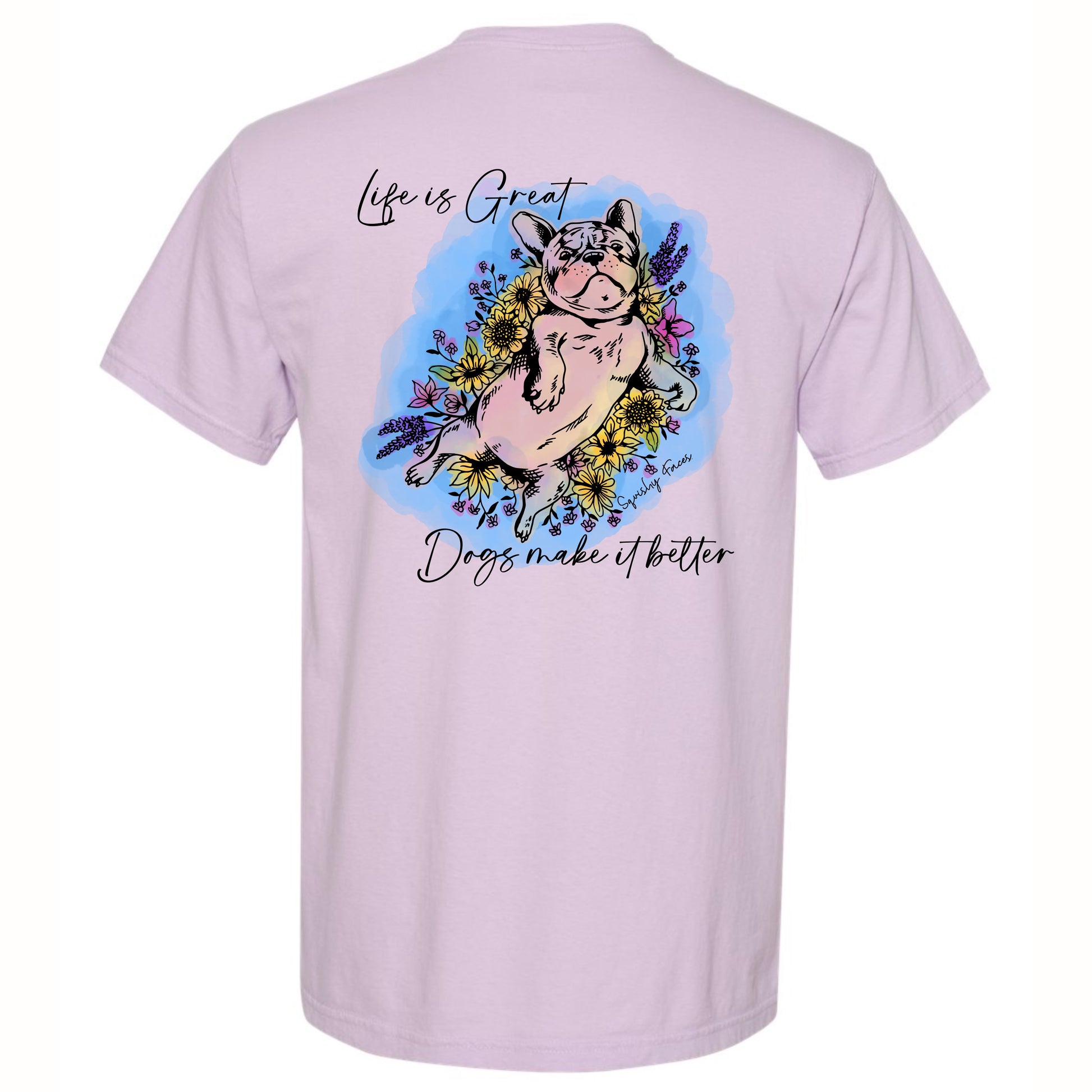 Life is already great but dogs make it so much better. Look at this adorable frenchie laying a pile of flowers!