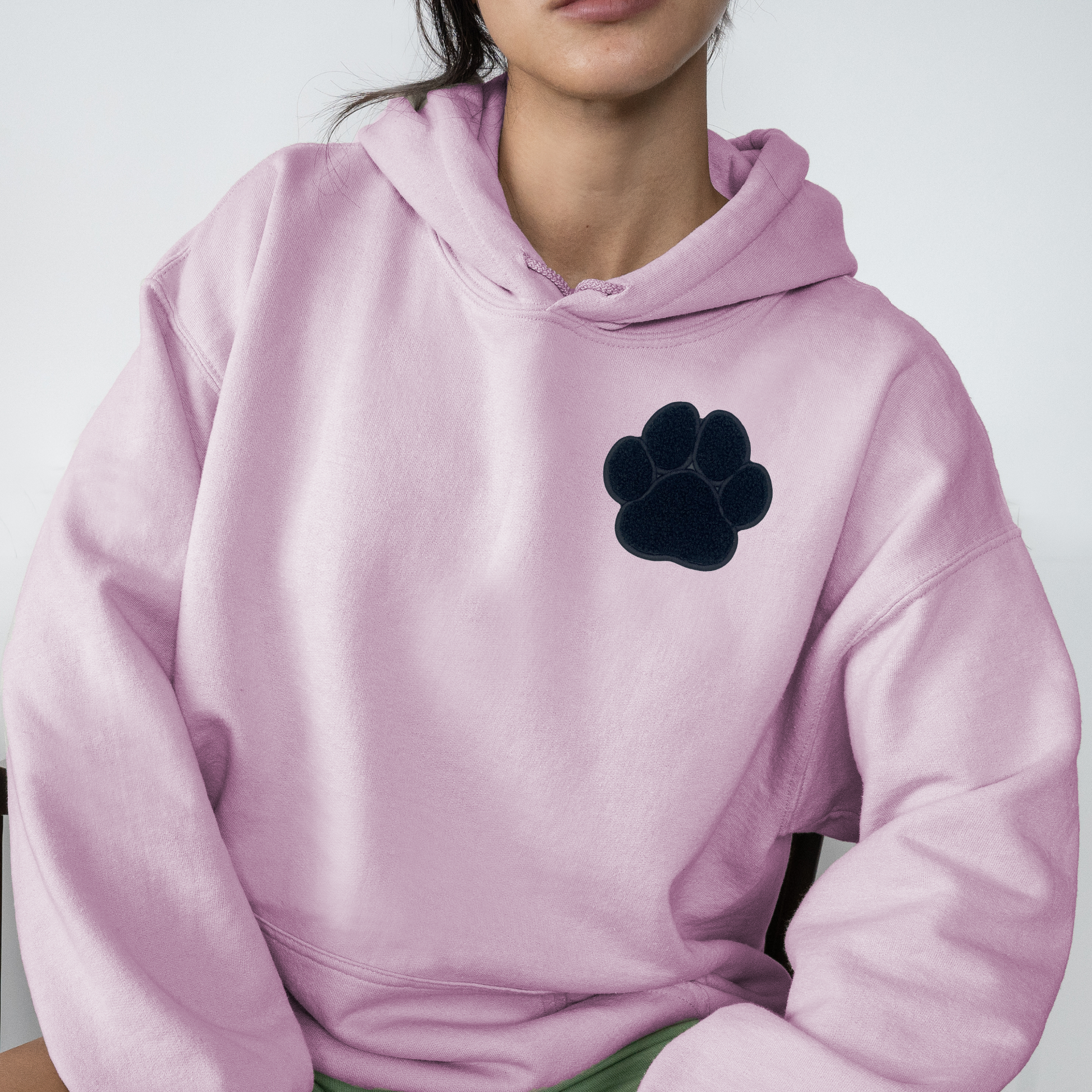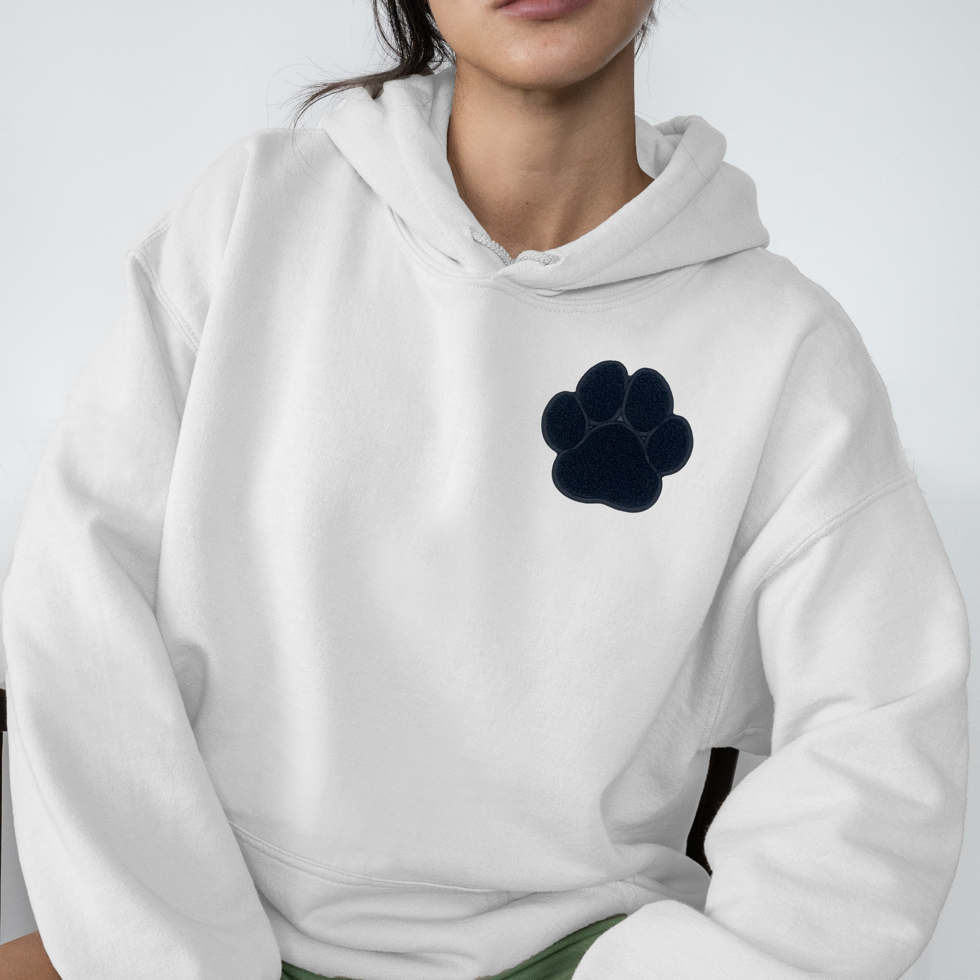 The most comfortable hoodies with a black paw print patch are now available! This super comfortable hoodie is available in light pink and white. Both of the hoodies will make the black paw print pop!
